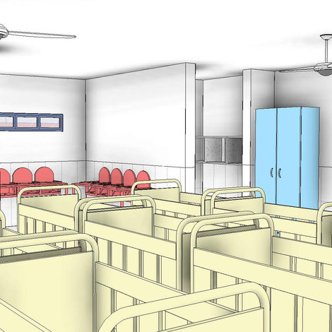O projeto da Creche Comunitária Menino Jesus, permite uma visualização tridimensional da organização espacial e funcional da edificação. O layout evidencia a clara setorização dos ambientes, com áreas bem definidas para atividades pedagógicas, espaços administrativos, de serviço e lazer. No centro do conjunto, destaca-se um amplo pátio com elementos lúdicos e espaço de apresentações, promovendo a convivência e a interação entre as crianças. Esse pátio central atua como o coração do projeto, conectando visualmente e fisicamente os demais setores da creche.